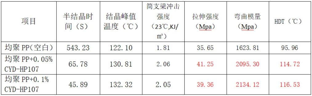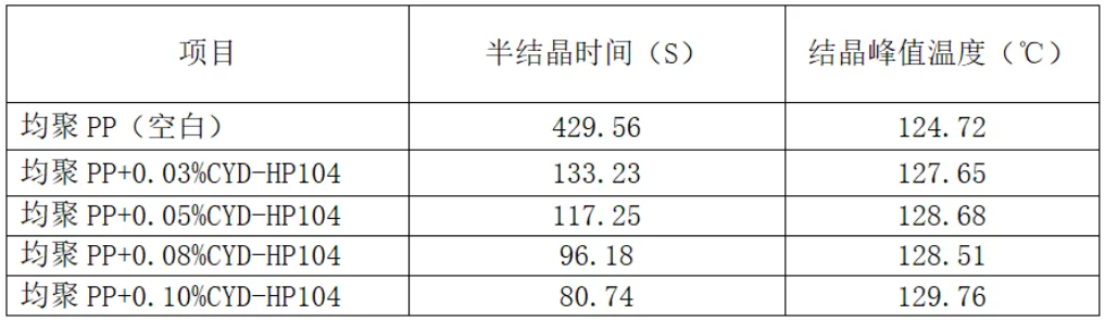 (1)成核劑CYD-HP104對(duì)PP半結(jié)晶時(shí)間以及結(jié)晶溫度的影響